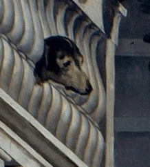 Ce que j’aime aussi dans ce tableau, c’est qu’il possède tellement de détails que l’on peut demeurer longtemps face à lui sans avoir tout remarqué. Aviez-vous noté, par exemple, le chien, en haut à gauche, dont la tête dépasse d’une balustrade ?