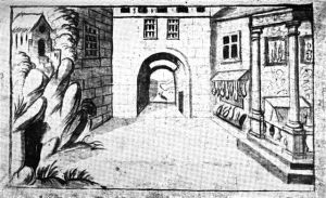 Décoration d’une tragi-comédie du XVIIe siècle, dans le Mémoire de Mahelot (source Wikipédia)