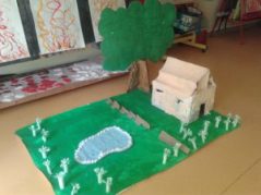 À quoi cela ressemble-t-il, concrètement ? Eh bien, voici un premier exemple, construit avec mes élèves et correspondant à la célèbre histoire de Pierre et le Loup. On peut voir la maison de Pierre et de son grand-père, le jardin, la haie, la forêt, la mare.