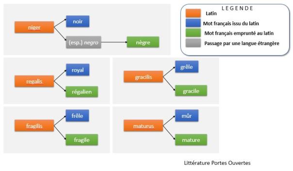 Puisqu’une image vaut mieux que cent paroles, voici de petits schémas permettant de mieux comprendre. Un cas particulier est celui de l’emprunt au latin via une langue étrangère.