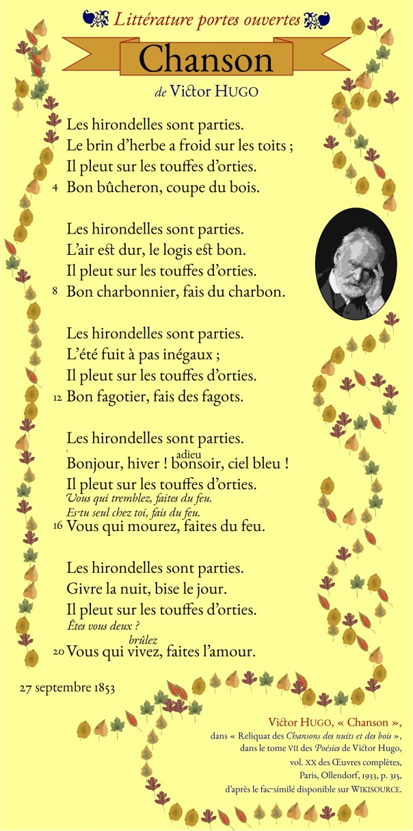 Victor Hugo écrivit ce poème il y a exactement 164 ans, jour pour jour, un 27 septembre. C’était un mardi. La chaleur de l’été commençait à s’estomper, et déjà les hirondelles avaient disparu du ciel français. Il pleuvait sur les touffes d’orties, et cette atmosphère un peu terne lui a inspiré cette chanson à la fois légère et mélancolique. Ce poème n’a rien perdu de son actualité : nous aussi, préparons-nous à affronter l’hiver, auprès d’un bon feu de bois. Qu’en pensez-vous ?