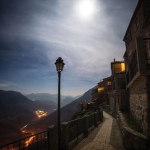 Les photographies, tournées vers le ciel, donnent à voir les clochers et les ruelles sous les étoiles, mais aussi les villages recroquevillés au pied de sommets enneigés. Les poses longues permettent à la couleur de se révéler avec intensité.