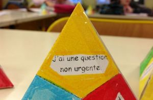 J’ai également eu recours à ce que l’on appelle, par jeu de mots, le « tétra-aide ». Il s’agit d’un tétraèdre de papier, que les enfants construisent par pliage et collage, indiquant selon un système de couleurs le degré d’urgence avec lequel les élèves ont besoin que le maître se rende auprès d’eux pour les aider.