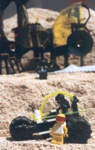 Plus tard, nous avons aussi utilisé les Legos comme support pour l’imagination d’une histoire plus élaborée, quand j’avais six ans. La base lunaire que nous avions construite servait de point de départ à une aventure racontée sous forme de roman photo. La petite figurine à tête jaune a ainsi été photographiée dans le jardin. Un tuyau en plastique figurait un tunnel souterrain percé par une excavatrice. Les bosquets de prêles représentaient une forêt cachée dans les entrailles de la Lune. Un dinosaure en plastique à été recouvert de pâte à modeler pour permettre au héros de se fixer sur son dos. Mon père m’a ensuite montré comment taper le texte à la machine pour le placer en regard des photos dans un petit album. Il m’a aussi enregistré lisant l’histoire tandis qu’il ajoutait bruitages et musiques de sa composition. Je me revois dans le garage, où se trouvait le matériel de musique de mon père, en train de lire notre récit devant le micro.