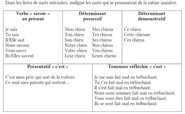 On le voit, cette leçon intègre une terminologie plus avancée que ce qui se fait généralement. Celle-ci n’est bien sûr pas à retenir. Je n’exige évidemment pas de mes élèves qu’ils parlent de « présentatif » ou de « tournure réfléchie ». Mais j’ai malgré tout inscrit ces termes, afin de montrer que ces formes ont un nom et qu’elles sont donc différentes des autres. Les élèves devaient eux-mêmes trouver les mots de même prononciation dans les différentes listes.