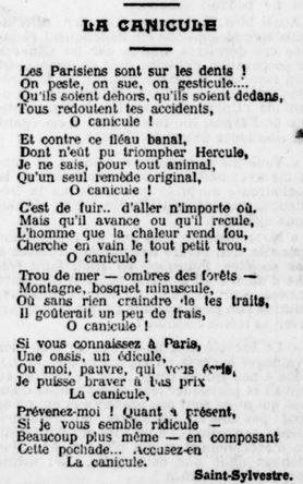 • Où ce poème a-t-il été publié ? Ce poème a été publié dans le journal Le Soleil, à la date du 9 août 1911, en première page. On peut lire ce journal sur le site Retronews. On peut également lire sur ce même site une chronique intéressante passant en revue différents articles parus en 1911 sur le sujet de la canicule.