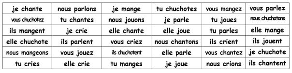 - Cette activité à elle seule ne suffit pas à permettre aux élèves de savoir conjuguer des verbes du premier groupe au présent. Des exercices plus traditionnels ont alors tout à fait leur place, dans la mesure où leur répétition favorise la mémorisation des formes. Il est en outre absolument essentiel pour l’élève de devenir un lecteur régulier, afin de s’habituer à rencontrer ces formes verbales dont les terminaisons sont bien souvent, hélas, inaudibles à l’oral.