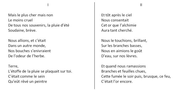 La deuxième partie du poème montre le retour du beau temps après la pluie. La référence alchimique transforme la réalité météorologique en quelque chose de merveilleux. Cet « or » est présenté comme palpable, comme si, pour une fois, la transcendance était accessible : « Nous le touchions ». Il s’agit même de quelque chose que l’on peut goûter en même temps que les gouttes de pluie qui perlent des « branches basses ».