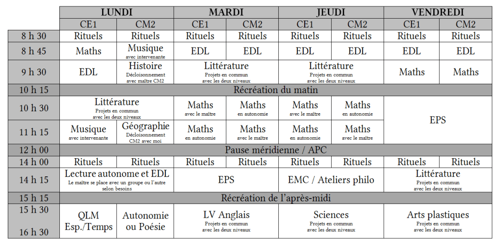 Je travaillais dans une classe à 5 niveaux. J’adorais l’ambiance cette classe et ma façon de travailler. J’aurais aimé ces 2 niveaux CE1 et CM2 ensemble.
