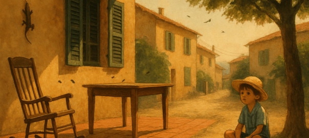 Voici soudain l’été. L’air brûlant sur la terrasse aux carreaux rouges semble figer le temps. Plus rien ne bouge, sinon les mouches qui volettent en vain autour de la table débarrassée, discrètement épiées par un lézard sur le mur parfaitement immobile. Les oiseaux eux-mêmes ont cessé leur chant, et l’on n’entend plus au loin que quelques cigales dont le chant se perd dans la rumeur lointaine de la route. Les volets s’entrecroisent sur les façades des maisons, dont les habitants en quête de fraîcheur désertent les jardins. Il n’y a plus personne, plus rien ne bouge, sinon une vieille chaise à bascule qui se balance en grinçant. Sous un arbre, un petit garçon qui ne souffre pas de la chaleur et ne comprend rien à la sieste attend que tout ce monde sorte de sa torpeur et veuille enfin jouer avec lui.