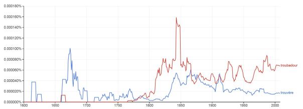 À propos de ces deux mots de trouvère et de troubadour, il est intéressant de noter l’évolution de leur emploi dans les écrits français recensés par Google depuis 1500 : le troubadour (qui est le mot de langue d’oc) semble avoir supplanté le trouvère (mot de langue d’oïl) dans le français commun.