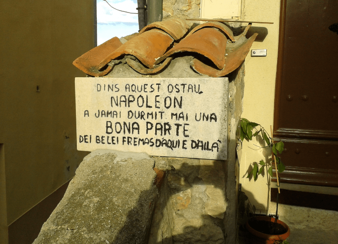 Je ne parle pas niçois, mais on devine la traduction : Dans cet hôtel, Napoléon n’a jamais dormi, mais une bonne part (Bonaparte) des plus belles femmes d’ici et d’ailleurs.