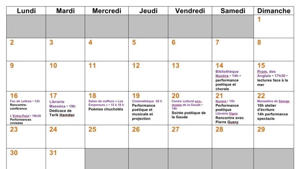 Pour célébrer comme il se doit la poésie, la compagnie « Une petite voix m’a dit » a prévu un programme riche et dense. Vous pourrez lire le détail du programme directement sur leur site Internet. En voici une version condensée sous forme de calendrier :