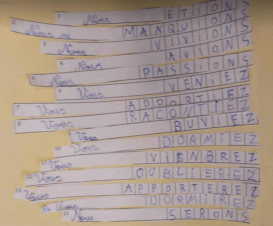 Parmi les nombreuses propositions d’activités pédagogiques qui m’ont été soumises pendant ma formation d’enseignant, j’ai été séduit par les bandelettes de la conjugaison. L’idée est de permettre aux élèves d’observer par eux-mêmes les régularités, en leur offrant la possibilité de les rendre très visuelles. Je vous explique aujourd’hui de quoi il s’agit.