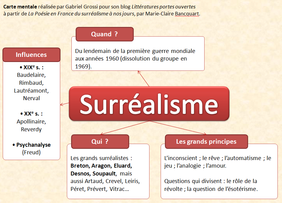 Le petit ouvrage La poésie en France du Surréalisme à nos jours, par Marie-Claire Bancquart, fournit en son premier chapitre une synthèse claire de ce qu’est le surréalisme. Afin d’éviter de simplement reformuler ce qu’elle dit de façon si concise, et parce qu’une image vaut mieux que cent discours, voici une carte mentale sur le surréalisme, réalisée par mes soins à partir de cette source.