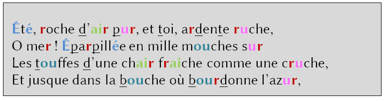 La peinture de cet été est profondément travaillée par un savant tressage d’échos sonores. Impossible de passer à côté, tant elle est marquée, de l’allitération en [r] qui apparaît dans toute la première strophe. Citons-la de nouveau, cette strophe, en soulignant les assonances et allitérations principales (il y en a tellement qu’il faudrait colorer presque tout le texte si l’on voulait les noter toutes) :