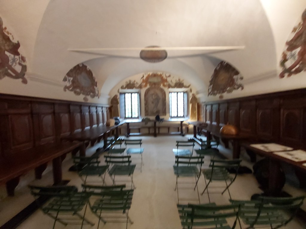 Au terme de ce prélude, l’assemblée a été conduite vers le réfectoire du monastère, orné de fresques représentant les quatre vertus cardinales du bon moine franciscain. C’est là que nous avons présenté au public les résultats de l’atelier d’écriture du matin, chacun venant lire à tour de rôle le texte produit.