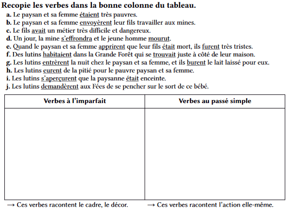 Avec la première séance, les élèves ont été sensibilisés à la découverte du passé simple. Ils l’ont repéré eux-mêmes en utilisant un critère très simple : il s’agit d’une flexion non encore apprise. La deuxième séance revient sur l’identification des verbes au passé simple, à travers un exercice qui reprend des phrases très proches de celles du texte découvert lors de la séance précédente, avec un tri en deux colonnes : imparfait ou passé simple. Les élèves prennent ainsi conscience du fait que ces deux temps alternent généralement dans les récits. Il ne s’agit pas encore de comprendre les raisons aspectuelles qui motivent le choix de l’imparfait ou du passé simple : cela est approché en fin de séance, et sera précisé lors des séances suivantes. En fin de séance, on pourra aussi commencer, à l’oral, à identifier le marqueur -t pour la troisième personne du singulier, et le marqueur -nt pour la troisième personne du pluriel : on précisera qu’il s’agit là de marques régulières, déjà connues pour d’autres tiroirs verbaux.