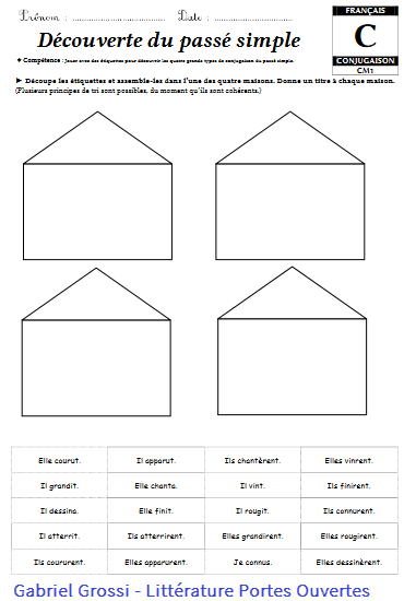 S’agissant du passé simple, le classement des verbes en trois groupes n’est guère pertinent. Il y a bien quatre grands types de verbes au passé simple, en -a-, en -u-, en -in- et en -i-. Les élèves vont découvrir ces quatre types à travers un problème ouvert de classement. Ils disposeront de quatre « maisons » dans lesquelles ranger des étiquettes comportant des verbes au passé simple. Les verbes sont tous aux troisièmes personnes du singulier et du pluriel, excepté une forme de première personne destinée à invalider un classement trop simpliste il/elle/ils/elles. En effet, il m’importe que les élèves regardent vraiment les terminaisons.