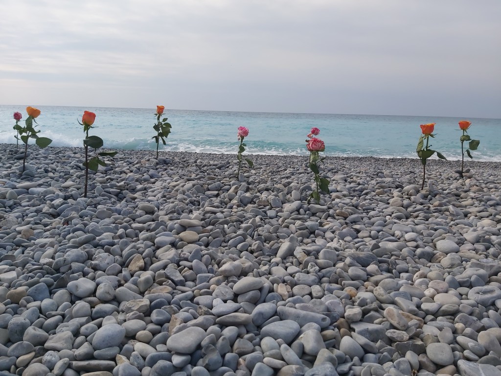 Face à ces mots, face à la mer, chacun se recueille, chacun médite. La mer, l’amour, la mort. Y a-t-il sujet qui nous concerne davantage ? Chacun contemple ces roses éphémères fichées dans les galets, magnifique symbole, car polysémique : images d’espoir et de vie, d’une vie capable d’émerger de l’aridité des galets, mais aussi images de fragilité, rappel de notre mortelle condition. Une illustration parfaite du thème de l’éphémère.
