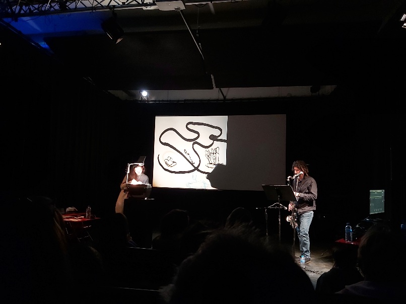 Le soliste lyonnais aux origines italiennes, sardes et grecques, chemise noire, longs cheveux hirsutes, fait alterner les mots avec les notes de sa clarinette basse et de sa guimbarde. De l’autre côté de la scène, à distance et pourtant dans une évidente complicité, Laurie Camous dessine au feutre sur des transparents rétroprojetés. Ses coups de marqueur épousent le rythme des mots. Quelques lignes épurées prennent vie sous nos yeux et soulignent le texte d’une image éphémère. Aucun des deux artistes ne cherche à ramener la couverture à lui, c’est vraiment à un beau duo qu’on assiste, avec une grande simplicité d’interprétation qui permet d’atteindre à l’essentiel.