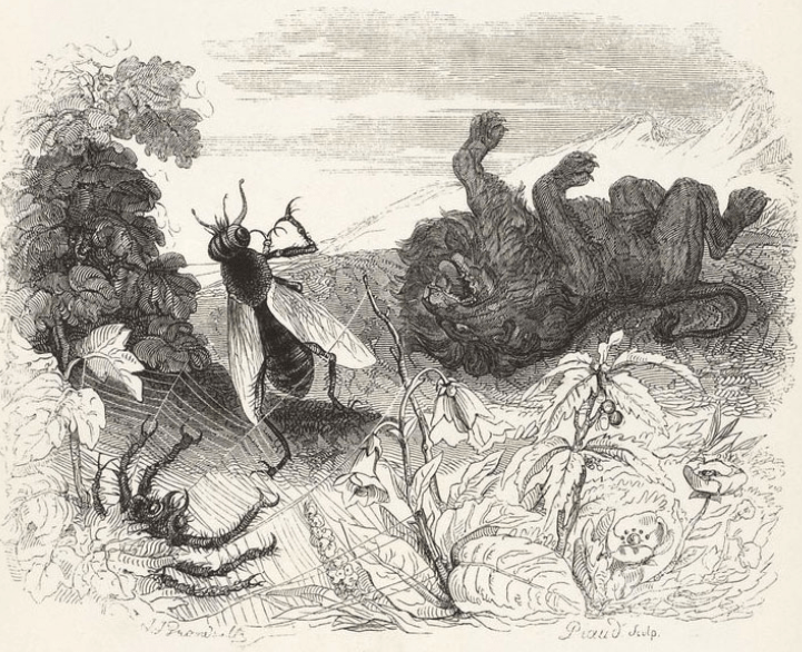 Le moucheron est déjà prêt à fanfaronner de sa victoire. Le voilà qui « rit » et qui exulte : il a vaincu, lui le petit insecte de quelques millimètres, le Roi des animaux. Mais sa victoire ne sera que de courte durée, et il n’aura guère le temps de la chanter.