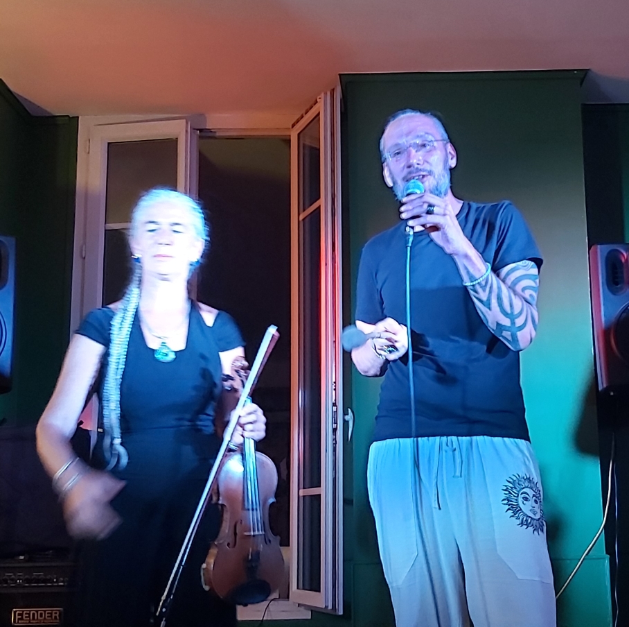 Nice, 13 rue Trachel, le 29 juillet, un peu avant 19 h. J’arrive devant une devanture couverte de fleurs et de livres. L’enseigne indique « La Trésorerie ». Un espace associatif pour faire revivre le quartier de la gare. Ce soir, la scène est confiée à Michel Saint-Dragon, poète, performeur, slammeur, accompagné au violon par Sophie Allain. Avec, en première partie, un petit spectacle de Laurie Camous.