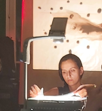 Petit à petit, la salle se remplit. Laurie Camous installe son rétro-projecteur. Vous savez, cet appareil désormais un peu désuet, mais naguère présent dans bien des salles de classe, qui permet de projeter des documents imprimés ou écrits sur des feuilles transparentes. Autour de cet objet, Laurie Camous entreprend une performance tout à la fois plastique et scénique. Armée de ses feutres noirs, elle dessine ses émotions et les projette au mur. Comme si on pouvait voir dans son cerveau. Elle se fait tour à tour conteuse, poétesse, comédienne, plasticienne. Elle nous happe bien vite dans son univers insolite. Son but, ce soir, est de nous parler de la peur. De nos petites phobies comme de nos grandes angoisses. Ce qui séduit, c’est sa capacité à passer de la plus grande légèreté à la plus grande intensité. Nous sommes tous renvoyés à nos propres inquiétudes, mais avec ce qu’il faut d’humour et de folie pour que l’ensemble reste attirant. On se laisse volontiers entraîner dans l’univers un peu barré de Laurie Camous.
