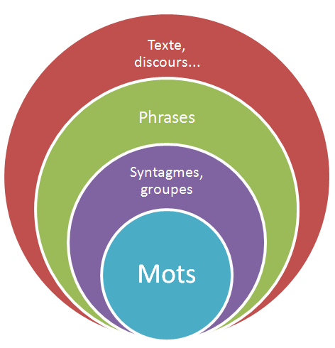Comme le montre mon schéma ci-contre, les mots se combinent en syntagmes (groupes), qui eux-mêmes forment des phrases, qui elles-mêmes composent des textes ou des discours.