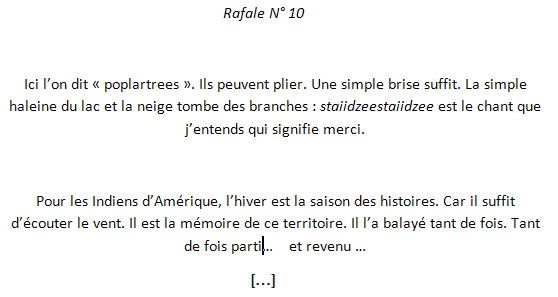 Il est capital de savoir d’où l’on vient, sans quoi on ne sait pas où l’on va. Et c’est le territoire, la relation forte et organique qu’on entretient avec lui qui fait l’humain, ce pendant des générations, selon des principes de vie collectifs. Un individu ne peut être épanoui qu’en prenant conscience que le collectif, ce plus grand que soi, est à mettre au centre de sa vie. Générosité, solidarité, sincérité, droiture, éthique, courage, altruisme, sont des valeurs reconnues dans ces cultures amérindiennes. Quand un (ou une) Indien(ne) prend la parole, il ou elle parle ses ancêtres et son territoire : littéralement, n’est pas cela la poésie ?