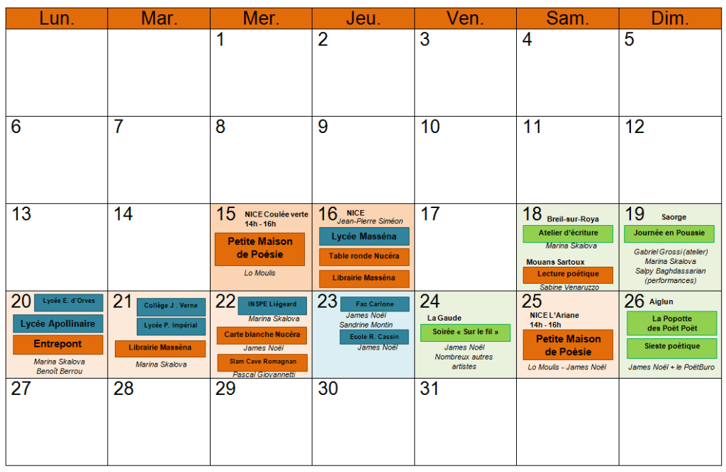 Dans le calendrier ci-dessous, vous trouverez en orange les événements ayant lieu à Nice, en vert les événements ayant lieu hors de Nice, et en bleu-gris les événements réservés au public scolaire. Les noms des principaux artistes concernés par l’événement est indiqué en italiques.