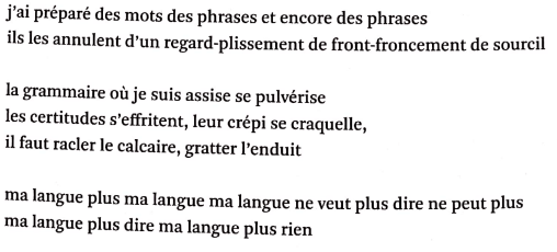 Ce passage est fortement marqué par l’opposition du « je » et du « ils ». D’une part, la poète qui arrive à la rencontre des migrants, pour un atelier d’écriture, avec sa préparation, ses idées. Et puis, forcément, cette belle préparation est rapidement catapultée par la force du réel, par le vécu tragique qui se devine dans un regard, dans un silence. Marina Skalova traduit ce vacillement, ce trouble. Tout autant bouleversée que ses interlocuteurs, la voici elle-même conduite à s’interroger sur sa propre langue, jusqu’à la limite de l’aphasie, du silence, du « plus rien ».