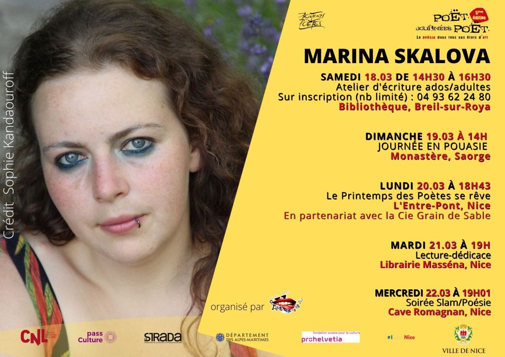 • Vous pourrez enfin découvrir Marina Skalova autrement, par l’entremise du slam, en vous rendant à la Cave Romagnan le mercredi 22 mars.