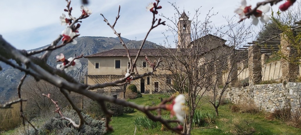 9h45. J’arrive à Saorge, après un petit arrêt à Breil pour consulter mes messages. Pour être déjà venu à plusieurs reprises, je sais qu’il est quasiment impossible de trouver à se garer dans le village. Je range ma voiture en contrebas, et je poursuis à pied jusqu’au monastère. Le site n’est plus habité par les franciscains depuis longtemps. Le monastère est devenu un monument national ouvert au public, et accueille ponctuellement des résidences d’artistes. À l’accueil, on me confirme que je peux monter la voiture le temps du déchargement des nombreuses courses faites la veille. C’est en redescendant à la voiture que je croise Frédéric, membre du PoëtBuro, et Marina Skalova, poétesse invitée du week-end. Je fais deux aller-retours pour remonter les courses jusqu’au monastère sur le chemin pentu, en sueur, car malgré l’altitude, il fait plutôt chaud pour un mois de mars.