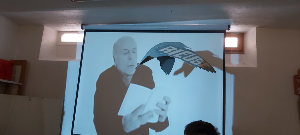 14h00. La bibliothèque de Breil se trouve tout près, à l’autre bout de la ruelle. Nous sommes accueillis par Hélène, une bibliothécaire passionnée, au léger accent néerlandais, qui organise régulièrement des ateliers d’écriture avec des villageois qui viennent régulièrement. On nous fait descendre au sous-sol de la bibliothèque, dans une pièce où sont suspendues des mouettes en carton. Nous nous installons, Marina prépare son ordinateur, et bien vite les participants font leur entrée.