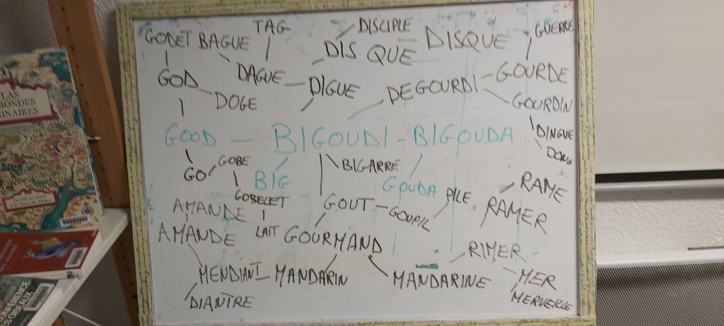 Marina Skalova commence par faire écouter un extrait d’atelier d’écriture qu’elle a conduit avec des personnes qui n’avaient aucune langue en commun, et qui ont malgré tout réussi à faire poésie en jouant sur les signifiants plutôt que sur les signifiés. Dans une sorte de ping-pong oral, ils énoncent, chacun dans leur langue, des mots phonétiquement proches du mot précédent. Sur ce modèle, nous avons créé une toile de mots à partir d’un mot de départ, choisi par un participant, qui a été « bigoudi ». Cette liste de mots a été la matière d’ un premier travail d’écriture, consistant à écrire en vingt minutes un texte comportant au moins vingt de ces mots.