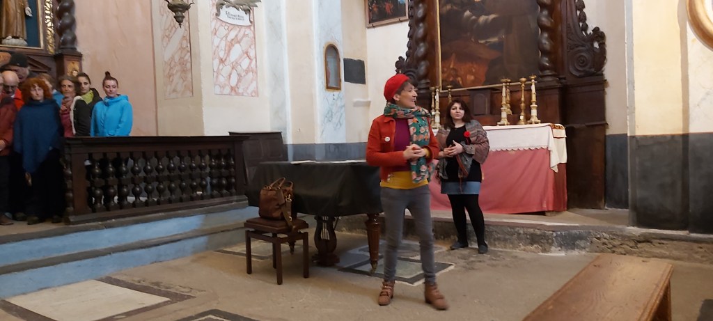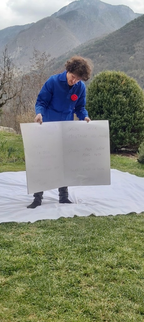 Nous expliquons aux participants qu’une restitution de ces textes est prévue le lendemain au Monastère de Saorge. Certains d’entre eux ne pourront être là, limités dans leurs déplacements par l’âge ou par le manque de moyens de transport. Mais Hélène se charge de récupérer les textes pour la restitution du lendemain.