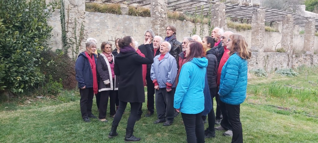14h00. Le public est rassemblé dans le jardin du monastère. La chorale dirigée par Gwen Masséglia entonne un chant polyphonique. Les voix s’élèvent dans la vallée, comme portées par cet écrin de montagnes. Cet accompagnement musical trace un trait d’union entre chaque performance poétique.
