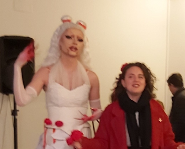 Elle s’appelle Aemona, mais ce soir elle joue le rôle de Dame Poésie. Très grande sur ses hauts talons, la Drag Queen porte une longue robe blanche, confectionnée avec talent par Morgane Attento. De nombreux petits papiers blancs recouvrent la robe, destinés à recevoir les « mots ressentis » du public. Elle est un repère lors de cette soirée, le seul personnage présent du début à la fin, puisqu’elle est Dame Poésie en personne.