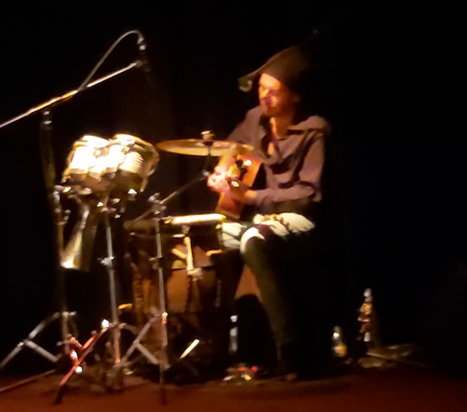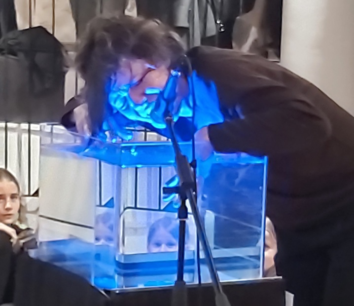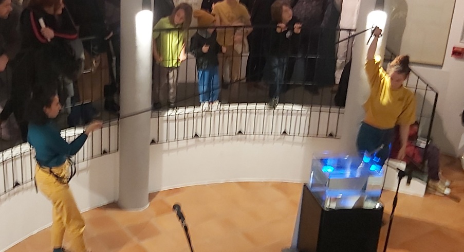 La chanteuse lyrique Danielle Bonito Sales occupe à présent l’espace. Elle joue tour à tour de la flûte et de sa voix, qu’elle mixe en direct grâce à sa pédale. Puis, elle s’approche d’un aquarium au-dessus duquel est suspendu un micro. Et là, de façon surprenante, la chanteuse livre une performance aquatique, plaçant sa bouche tantôt à la surface, tantôt sous l’eau, pour former des sons inédits.