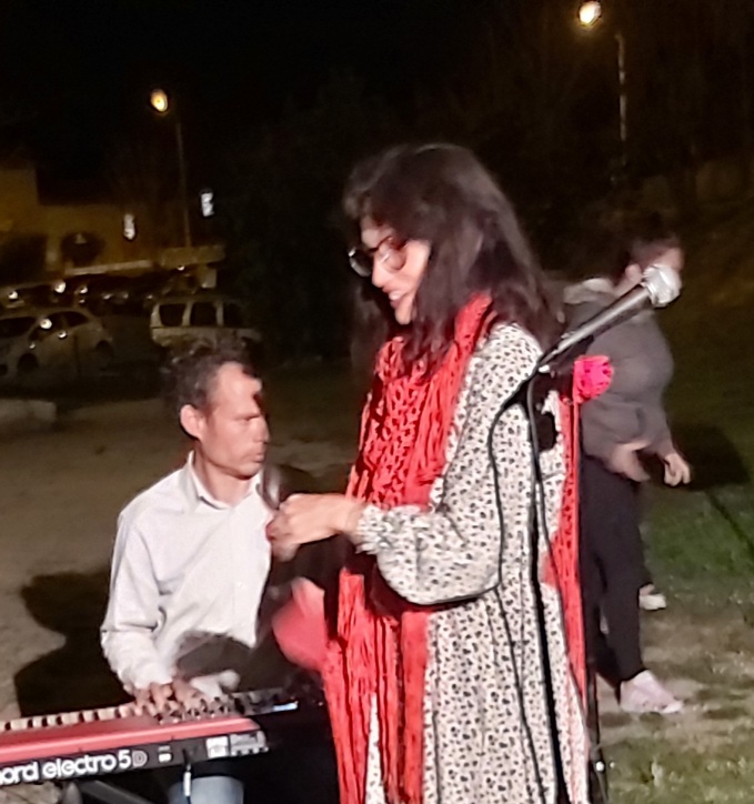 Dès que cesse la musique, nous sommes entraînés à l’extérieur par Dame Poésie. Dans le jardin, on suit le fil rouge qui s’enroule en spirale jusqu’à un duo d’artistes qui proposent des poèmes en musique sous les étoiles. La voix de Caroline Fay se mêle avec les notes de Jérôme Kocaoglu au synthétiseur. J’invite les enfants à s’asseoir au premier rang, mais bien vite, une partie d’entre eux part courir dans l’herbe pentue, fournissant un décor improvisé à cette performance insolite.