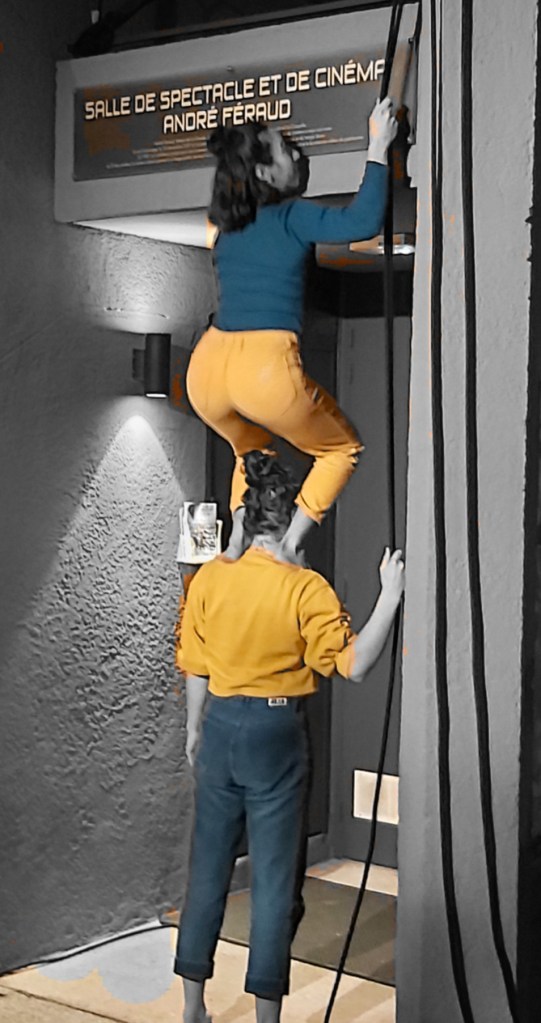 Mon ami Tristan et moi-même récupérons alors les cordes des carcassiennes pour former des cordées de spectateurs. Notre impro joue le fait que l’on va entrer dans une grotte poétique obscure. Il ne faut surtout pas lâcher la corde. Les spectateurs se prennent au jeu avec le sourire. Le but est en même temps de permettre au public d’atteindre la salle de cinéma et de s’y installer alors que celle-ci est volontairement laissée dans l’obscurité complète.