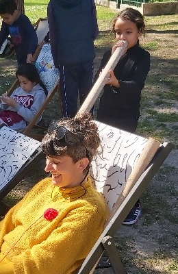 La journée s’est terminée avec une « sieste poétique », en comité réduit car un certain nombre de convives devait redescendre à Nice. Installés dans des transats, nous écoutons des extraits de « La voix est libre », anthologie sonore de poètes de tous âges, depuis les enfants des écoles jusqu’aux résidents de l’EHPAD de Cimiez, en passant par les voix de poètes confirmés. Parmi les sons diffusés, il y avait le travail des élèves de l’école du Soleil, à Roquestéron, dont certains étaient présents sur place pour écouter.