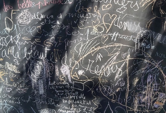 Bien vite, les enfants s’emparent les craies mises à leur disposition. Les plus jeunes font des dessins. J’explique le projet à ceux qui savent écrire. Je leur demande d’écrire des mots que leur évoque la poésie.