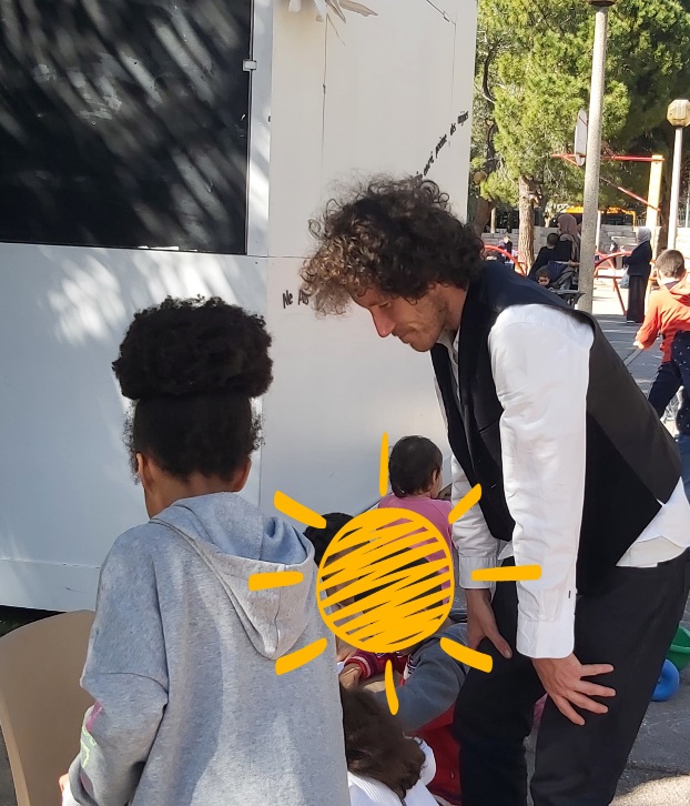 14h00. La Petite Maison de Poësie ouvre ses portes. Bien vite, les enfants font la queue devant l’entrée. On ne peut entrer que par petits groupes de trois, en laissant ses chaussures à l’entrée. Il faut gérer cette foule qui s’impatiente. Nous les faisons patienter en les installant dans les transats ou en leur donnant des craies. À l’intérieur, Lo Moulis ne chôme pas.