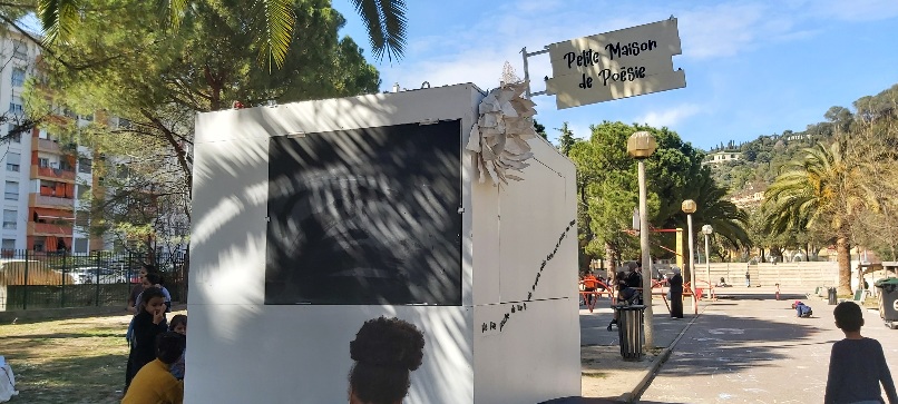 Samedi 25 mars, 8h25. J’arrive au square Lécuyer, dans le quartier de l’Ariane, chargé de la réception de la Petite Maison de Poësie. À ma grande surprise, celle-ci est déjà installée. Au bon endroit, heureusement. Un parallèlépipède blanc et noir, posé sur le gazon, à proximité des structures pour enfants. L’air encore frais du matin est particulièrement limpide. Personne dans le parc. La ville est encore endormie. Même les voitures sont peu nombreuses à défiler sur les avenues attenantes. De temps en temps une personne âgée avec un chien.