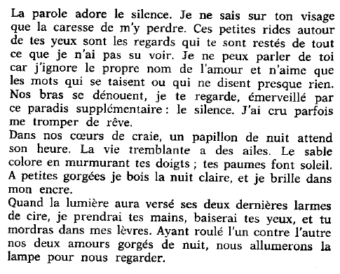Dans un passage de La Matinée à l’anglaise (1981), il développe une réflexion où se mêlent la parole poétique et la sensualité amoureuse. Ce motif sera maintes fois réécrit ensuite.