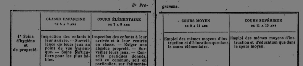 C’était il y a seulement cent dix ans, et pourtant il suffit de feuilleter ces programmes pour voir surgir une autre époque. Exercices militaires pour les garçons, couture pour les filles, qui bien sûr fréquentaient des écoles différentes. Insistance sur l’hygiène, en des temps où elle n’allait sans doute pas de soi.