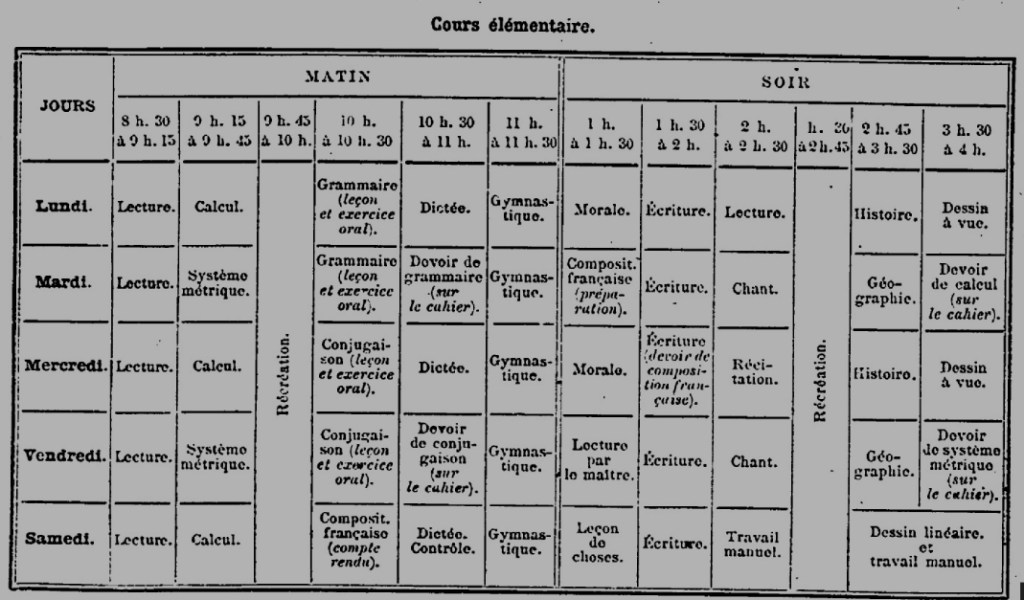 Voici, pour terminer, un exemple d’emploi du temps pour le cours élémentaire. On notera 30 heures de classe hebdomadaires, contre 24 aujourd’hui. On retrouve des pratiques qui ont toujours cours aujourd’hui, à savoir la lecture quotidienne, la dictée chaque jour avec évaluation hebdomadaire, la demi-heure de gym quotidienne (qui peut faire penser à nos fameuses APQ, même si le principe n’était pas du tout le même), la lecture offerte… Les matières enseignées sont globalement les mêmes, et je suis sûr qu’un enseignant d’aujourd’hui serait tout à fait capable d’appliquer les programmes de 1912.