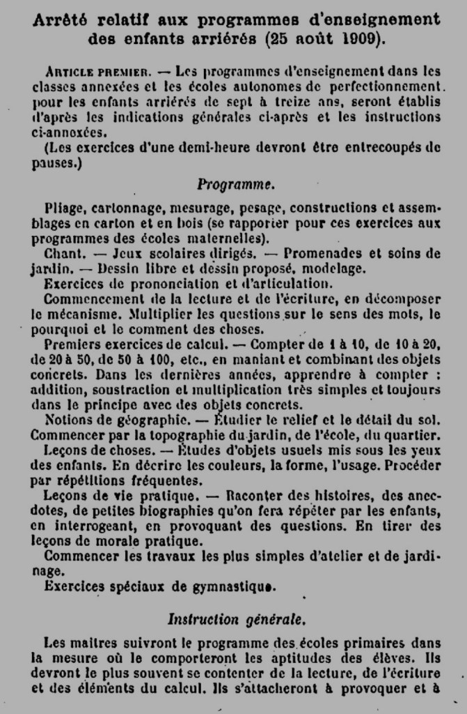 Enfin, les programmes de 1912 mentionnent l’existence d’écoles et de classes pour « enfants arriérés ». Oui, l’expression est choquante. Les enseignants s’inspirent des programmes généraux, mais peuvent accueillir des élèves jusqu’à 16 ans. Ces enfants ne sont donc pas inclus dans le cursus général. Au-delà de l’expression qui est évidemment choquante, on voit qu’il y avait, dès 1909, une certaine prise en compte du handicap mental. Ces enfants n’étaient pas privés d’instruction et il y avait déjà un souci de leur offrir une instruction. Bien entendu, contrairement à aujourd’hui, il ne s’agissait pas de chercher à compenser leur handicap pour leur permettre de se rapprocher le plus possible de la normalité. Mais enfin, j’ai été surpris de voir qu’il y avait quelque chose de prévu, c’est déjà mieux que rien du tout.